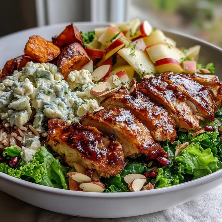 The beauty of this bowl is that it's incredibly flexible without losing its identity—I've made it with roasted chickpeas instead of chicken on days when I'm eating vegetarian, and it's just as satisfying. You can swap the almonds for walnuts or pecans, add roasted brussels sprouts or red onions if you want more vegetables, or even throw in some pomegranate seeds for brightness. The dressing is forgiving too—if you don't have Dijon mustard, whole grain mustard works, and if your honey is crystallized, warm it up first so it incorporates smoothly.