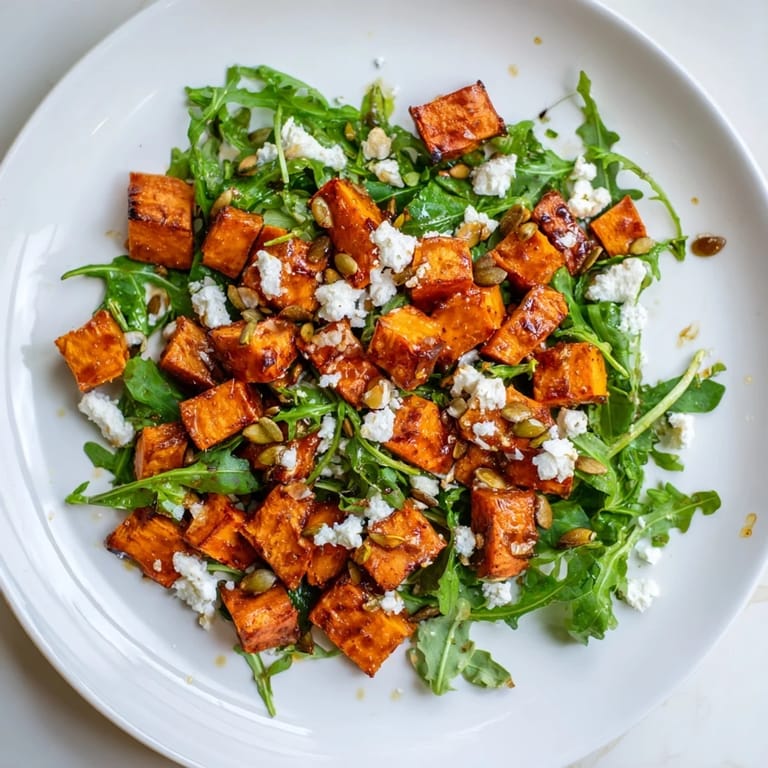 Save My neighbor showed up one autumn afternoon with a Tupperware full of this salad, still warm from her oven. She swore it was the reason her kids suddenly loved vegetables. I was skeptical until I tasted the sweet potatoes: caramelized edges, creamy centers, tangy feta melting into every bite. That evening I roasted my own batch, and by the time I tossed them with arugula and lime, I understood why she'd knocked on my door just to share it.